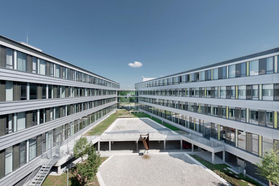 Erlangen: Der Bürokomplex für einen internationalen Energiekonzern schafft es trotz seiner schieren Größe, Maß zu halten. Für seine Gesamtkonzeption hat das Gebäude von der der Deutschen Gesellschaft für Nachhaltiges Bauen DGNB das Zertifikat in Silber erhalten.